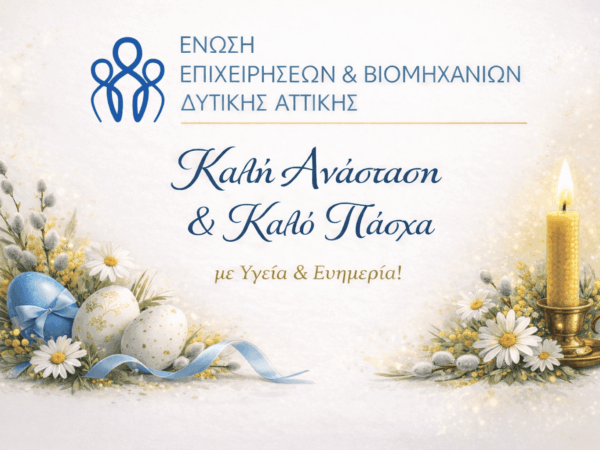 Η Ένωση Επιχειρήσεων & Βιομηχανιών Δυτικής Αττικής (ΕΕΒΙΔΑ) εύχεται σε όλους Καλή Ανάσταση και Καλό Πάσχα, με υγεία, ευημερία και προσωπική και επαγγελματική πρόοδο. Το μήνυμα της Ανάστασης αποτελεί διαχρονικό….