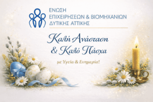 Η Ένωση Επιχειρήσεων & Βιομηχανιών Δυτικής Αττικής (ΕΕΒΙΔΑ) εύχεται σε όλους Καλή Ανάσταση και Καλό Πάσχα, με υγεία, ευημερία και προσωπική και επαγγελματική πρόοδο.